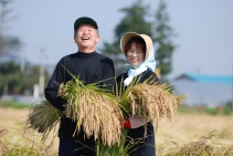 うまいお米づくりに欠かすことのできないのが牛糞堆肥です。堆肥は田んぼに散布され、土を、大地を耕します。大地に育まれた稲わらは大事に集められ、牛の粗飼料になります。また籾から玄米に脱穀する際に排出される籾殻は、牛の敷材になります。牛と共に営む米づくりは、捨てるものが一切ない、「完全循環型農業」です。天を敬い、米を仰ぎ、水を治め、牛を友に。そして人に、地球にやさしく。